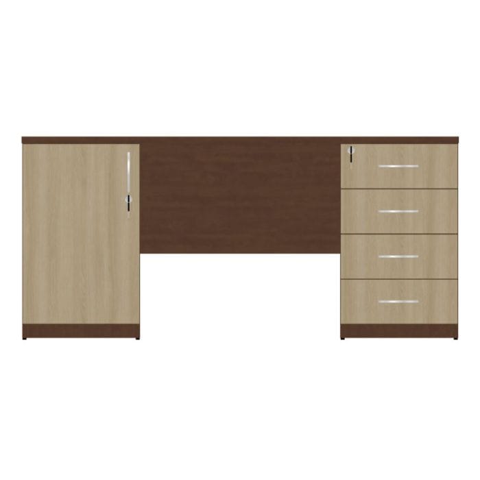 Podstawa biurka wykonana z płyty laminowanej dostępnej w 9 kolorach do wyboru. Front szafki może być wykonany z płyty laminowanej lub z płyty akrylowej dostępnej w 9 wariantach kolorystycznych.