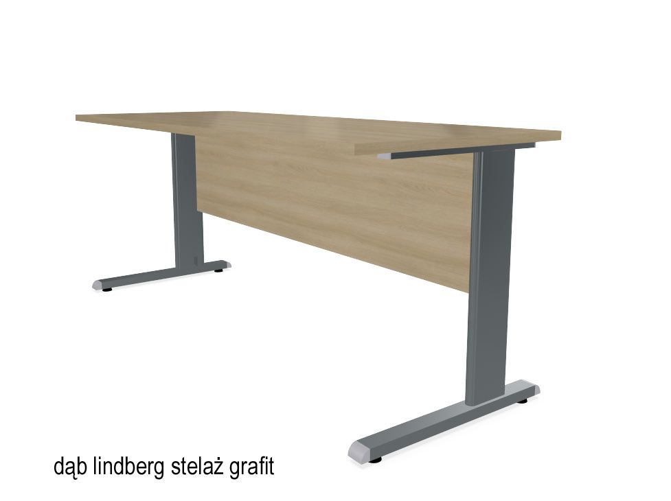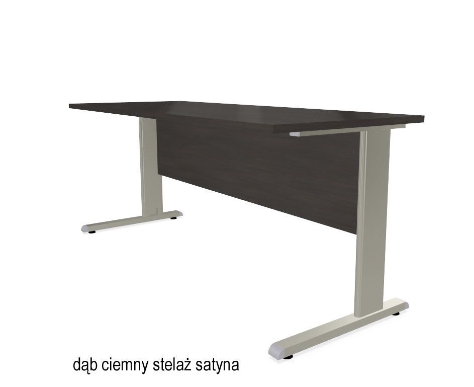 Biurko proste na stelażu metalowym, malowanym proszkowo w kolorze alu, o nogach w kształcie litery „L”, z pionowym prowadzeniem okablowania. Nogi wyposażone są w regulatory wysokości w zakresie 740-755 mm, połączone blendą konstrukcyjną o wysokości 40 cm z białej płyty laminowanej o gr 18 mm. Blat biurka wykonano z białej, gładkiej płyty laminowanej o grubości 25 mm, zabezpieczonej obrzeżem ABS.